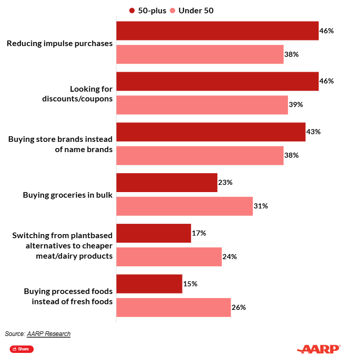 The adjustments don’t stop at the grocery store. At home, adults 50-plus are more likely to use pantry or freezer items before buying new groceries, with 43 percent doing so “much more often,” compared with 38 percent of adults under 50. Younger adults are more likely to serve smaller portions, substitute ingredients to avoid buying additional items and plan meals with fewer components.
