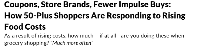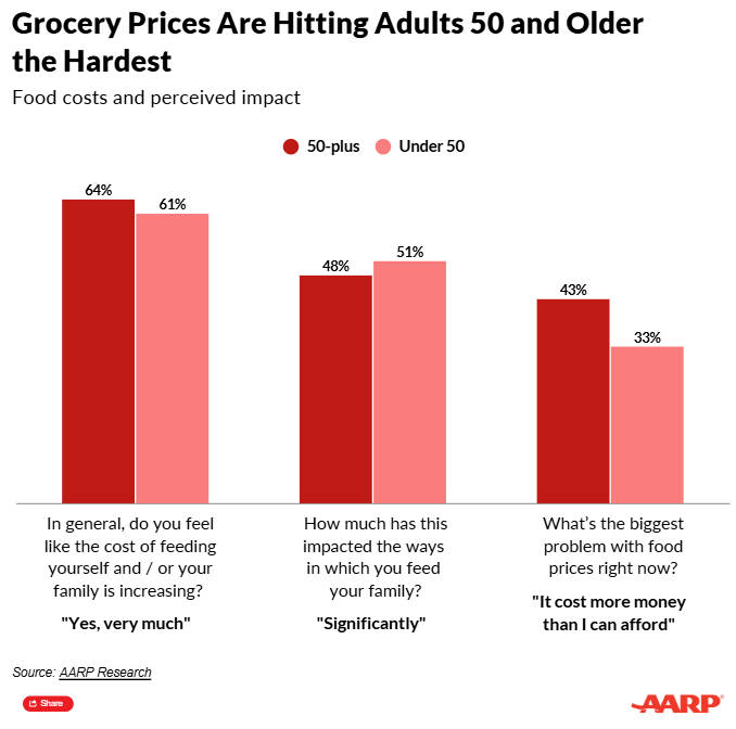 Concern is widespread across age groups. Among adults 50-plus, 78 percent said they are concerned about grocery prices, 64 percent said the cost of feeding themselves or their families is increasing “very much,” and 48 percent said rising costs have significantly changed how they feed their households. Among adults under 50, the comparable figures are 74 percent, 61 percent and 51 percent, respectively.